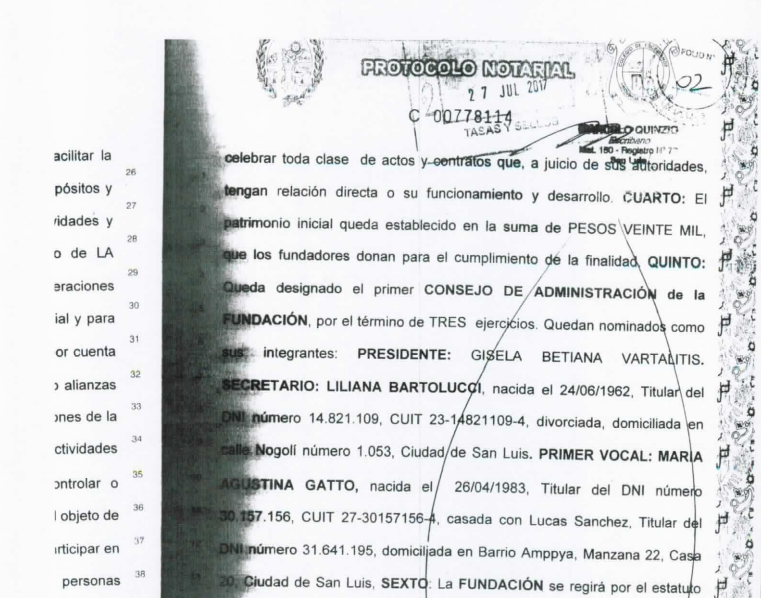Según el portal Zbol, El 21 de julio Adolfo Rodríguez Saá y Gisela Vartalitis se hicieron presentes en la escribanía ubicada en calle Colon 1024 de la ciudad de San Luis, para rubricar el acta notarial 247. Allí dejaron constancia de la puesta en marcha de la Fundación Mujeres Puntanas. (Clic aquí para ver el acta constitutiva de la Fundación). El Concejo Administrativo de la nueva ONG, según se dejó constancia ante el escribano Marcelo Quinzio, tiene como presidente a la esposa del candidato a senador nacional por el oficialismo provincial, en el cargo de Secretaria la histórica dirigente justicialista, Liliana Bartolucci y como única vocal, María Agustina Gatto, hija de la Secretaria de Viviendas de San Luis. El 3 de agosto ya tenía el reconocimiento, 9 días hábiles después del paso de los fundadores por la escribanía. (Clic aquí para ver el reconocimiento de la dirección de personería jurídica)