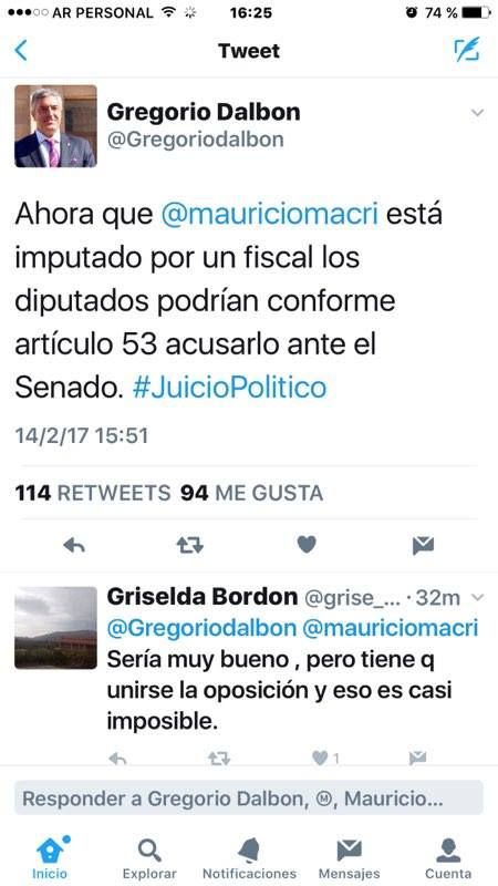 "Ahora que Mauricio Macri está imputado por un fiscal los diputados podrían conforme artículo 53 acusarlo ante el Senado. #Juicio Polício", propuso el abogado Gregorio Dalbón en un mensaje a través de las redes.