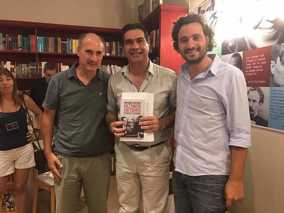 JUAN PABLO CAFIERO, JORGE CAPITANICH Y SANTIAGO CAFIERO EN LA PRESENTACIÓN DEL LIBRO "IMILITANCIA SIN TIEMPO" DE ANTONIO CAFIERO, EN UNA LIBRERÍA DEL NUETO DEL EX SENADOR.