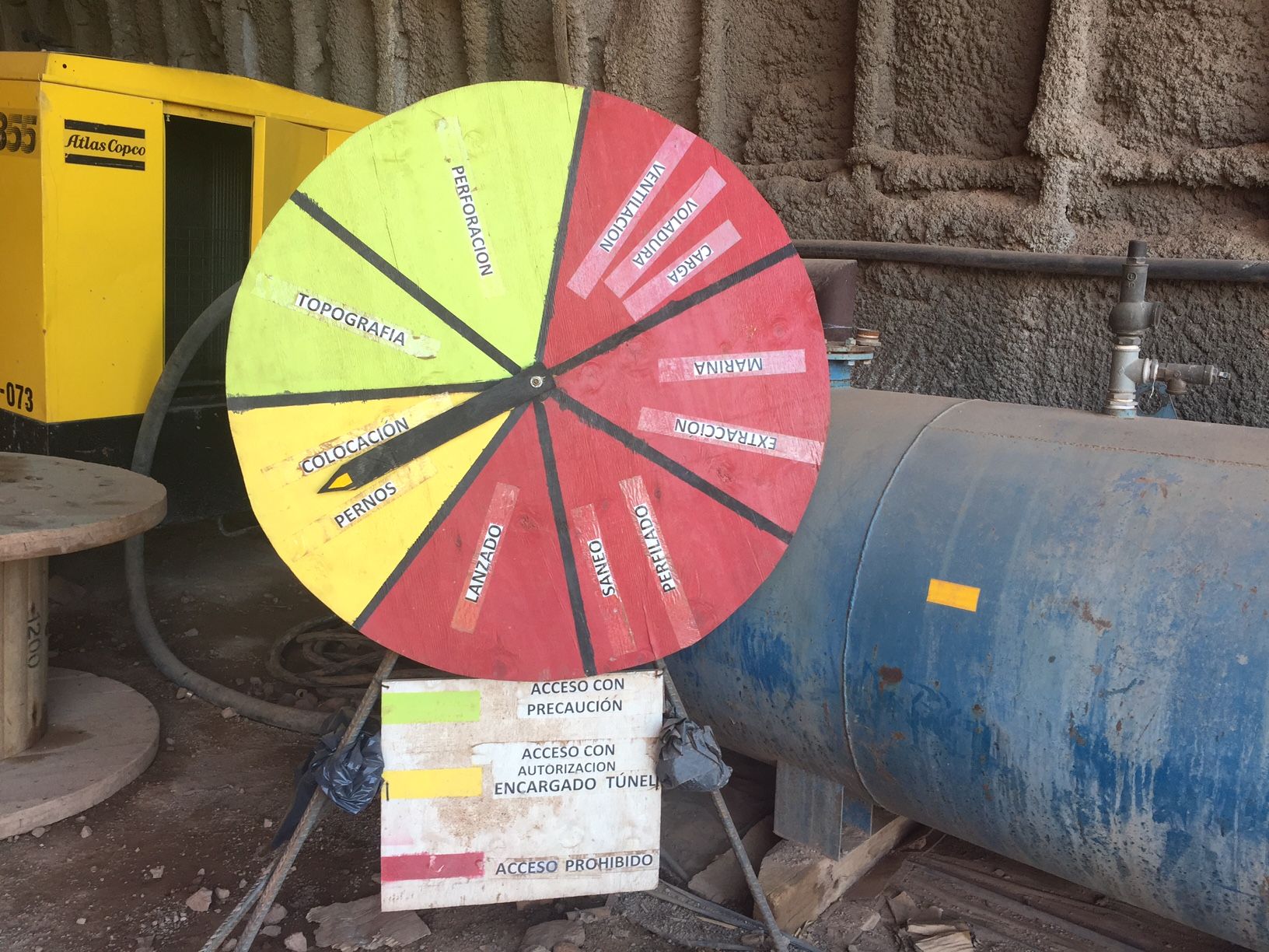 Una ruleta da la bienvenida al túnel. A partir de ella los operarios pueden orientarse sobre los trabajos que se están realizando en cada momento. Si la flecha apunta a "voladura", saben que deben tener especial cuidado; pero no es la única acción peligrosa, cada actividad tiene sus propios riesgos.