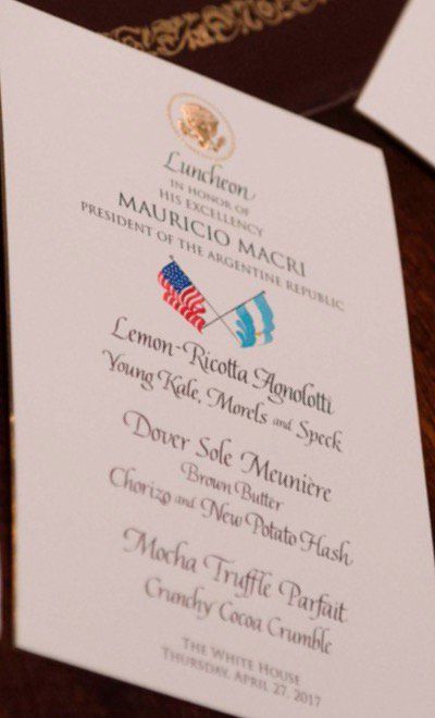El menú incluyó una entrada de agnolottis (similares a los ravioles) de ricota con limón (justamente, la exportación de limones a EEUU es una de las preocupaciones que tiene el presidente argentino).