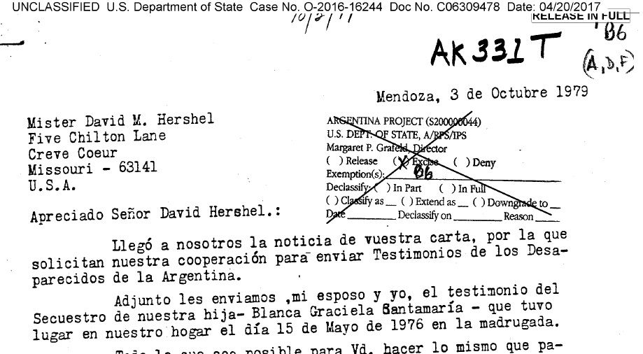 Los familiares de Blanca Santamaría también pidieron intervención de Estados Unidos para tratar de hallarla, ras el secuestro. Blanca Carlderón, madre de la joven estudiante, envió una carta desde el barrio Unimev. En ese caso respondía al pedido del Gobierno norteamericano para enviar testimonios sobre lo que ocurría en Argentina. "Adjunto les enviamos, mi esposo y yo, el testimonio del Secuestro de nuestra hija- Blanca Graciela Santamarla - que tuvo lugar en nuestro hogar el día 15 de Mayo de 1976 en la madrugada. Todo lo que sea posible para ud. hacer lo mismo que para todos los desaparecidos, se les agradecerá profundamente y de todo corazón. Nuestra angustia y tristeza infinita desde que no encontramos a nuestra hija, nos ha sumido en un dolor que solamente la certeza de que podremos recuperarla, hace que querramos seguir viviendo", dice la mujer en la misiva.