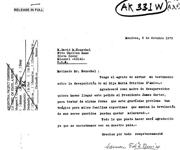 Los familiares de María Cristina D'Amico también recurrieron al mismo camino y enviaron una carta al gobierno de Estados Unidos. Agradeceré como madre de desaparecidos quiera hacer llegar este pedido al Presidente James Carter, para tratar de alguna forma que este gravísimo problema tan trágico para miles familiar argentinas que ansían la devolución de sus seres queridos puedan quedar aclarado", piden en la carta enviada el 5 de octubre de 1979.