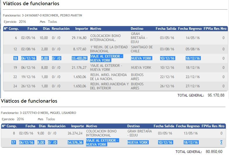 Pero en la rendición de cuentas de los viáticos hay algunas curiosidades. Así, por ejemplo, hay funcionarios que gastaron mucho más que otros a pesar de haber realizado el mismo viaje. El año pasado hubo una misión oficial a Estados Unidos para rendir cuentas ante el mercado financiero sobre las cuentas provinciales tras la colocación del bono internacional.