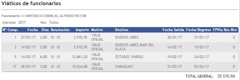 Cornejo gastó 78.830 pesos el año pasado en viáticos y en lo que va de 2017 declaró 35516 pesos. El Gobernador gastó menos que otros funcionarios de su gabinete, como Martín Kerchner, que es uno de los más "viajeros" oficiales y gastó 130.000 en viáticos, por misiones en los ministerios de los que fue o es parte. Allí no son tomados en cuenta las veces en las que ese Ministro viajó como autoridad de las dos comisiones oficiales por las que recibía recursos extra para viáticos.