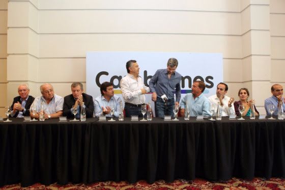 La mesa nacional de Cambiemos en Mendoza, distinguió (izq.) a los demócratas de Carlos Balter (socio sólo en la liga local), al sentarlo en la mesa principal. En el centro, entre otros, Emilio Monzó, Alfredo Cornejo, Marcos Peña y Gustavo Gutiérrez, de la CC.