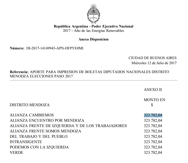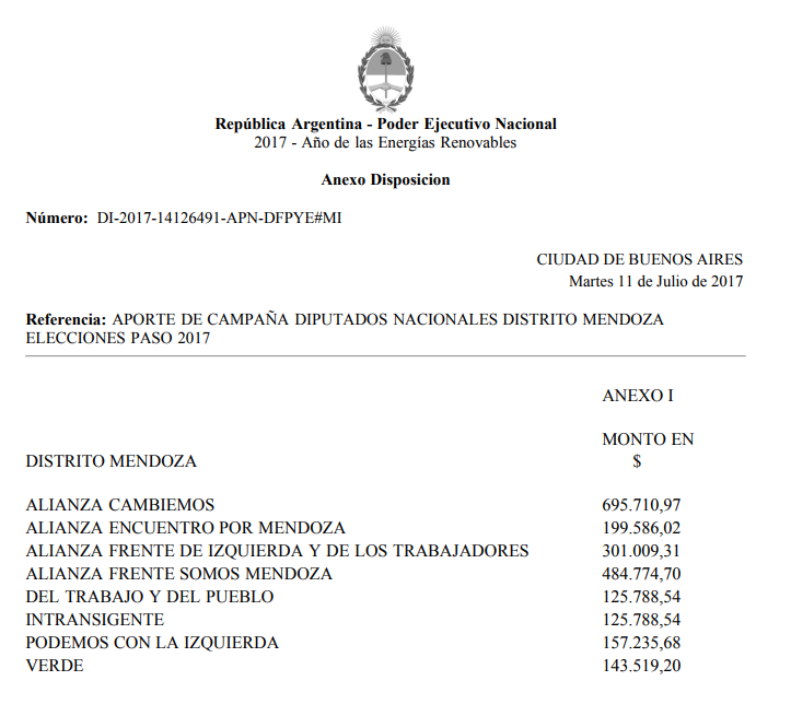 Es el dinero que aporta el Estado para los gastos de campaña para diputado nacional por Mendoza que harán las alianzas o partidos en las PASO. Por un lado, el aporte de campaña (que va desde $ 695.710 para Cambiemos a $125.788 para los partidos Intransigente, por un lado, y del Trabajo y del Pueblo, por otro) , y el dinero para la impresión de boletas , que es por igual en cada agrupación que se presenta: $ 323.782,04 por cada uno, $2.590.000, en total.