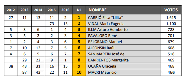 Por ejemplo, que Manuel Belgrano ocupe el 5º lugar y Carrió el primero, o que el Papa Francisco esté detrás de Jorge Lanata y de Cristina Fernández de Kirchner, René Favaloro por debajo de María Eugenia Vidal, Facundo Manes en el puesto 20 y su admirado Domingo F. Sarmiento en el 26, superado entre otros por el mendocino Abel Albino, que ocupa el 23º, son algunos de esos casos llamativos y, por qué no, controvertidos.