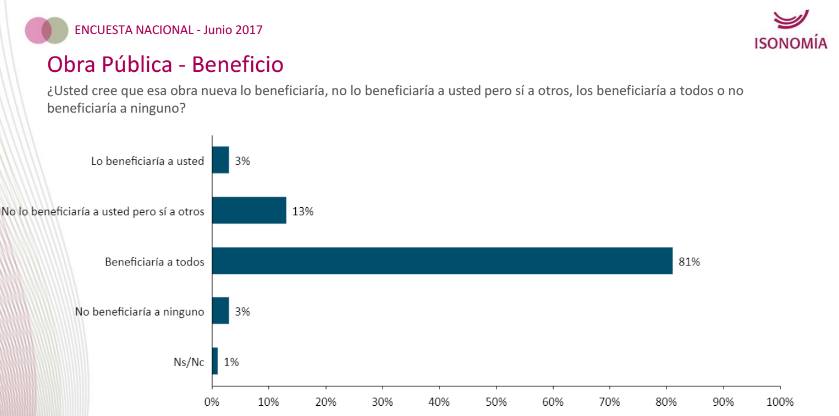 Ante el planteo de si en caso de observar una reactivación de la obra pública a quién cree que beneficiaría: el 81% estimó que a todos, el 13% que no lo beneficiaría específicamente a él pero sí a otros y el 3% que no sería beneficioso para nadie.