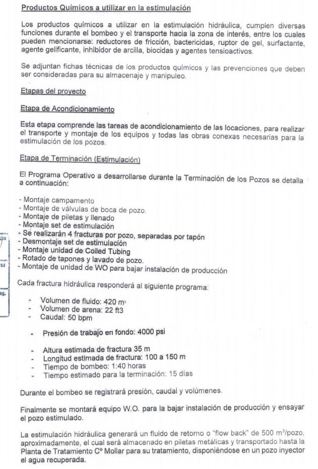 La perforación realizada llegaba hasta la "roca madre", a una profundidad de entre 1900 y 2500 metros. Lo que se autorizó ahora es a usar la metodología no convencional para estimular la roca y extraer el petróleo. Para ello se usa agua, productos químicos y sedimentos (arena fina); que son inyectados a presión para "abrir" la roca y liberar los hidrocarburos. A diferencia de lo que se hace habitualmente en Neuquén, en este caso son pozos verticales.