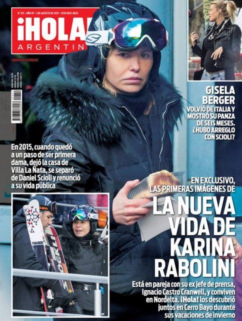 El texto que integra la nota de "¡Hola!", dice que "Karina Rabolini (50) consiguió lo que se propuso hace casi dos años: salir del centro de la escena y tener una vida normal. La política, con una campaña presidencial que la tuvo como protagonista sin ser siquiera candidata, dinamitó su matrimonio con Daniel Scioli . Después de pasar la mayor parte de su vida con el mismo hombre, a quien conoció cuando tenía apenas 18 años, ahora está descubriendo una nueva forma de amar. Su pareja, quien la acompaña durante estas vacaciones de invierno en Cerro Bayo, es Ignacio Castro Cranwell (45)".