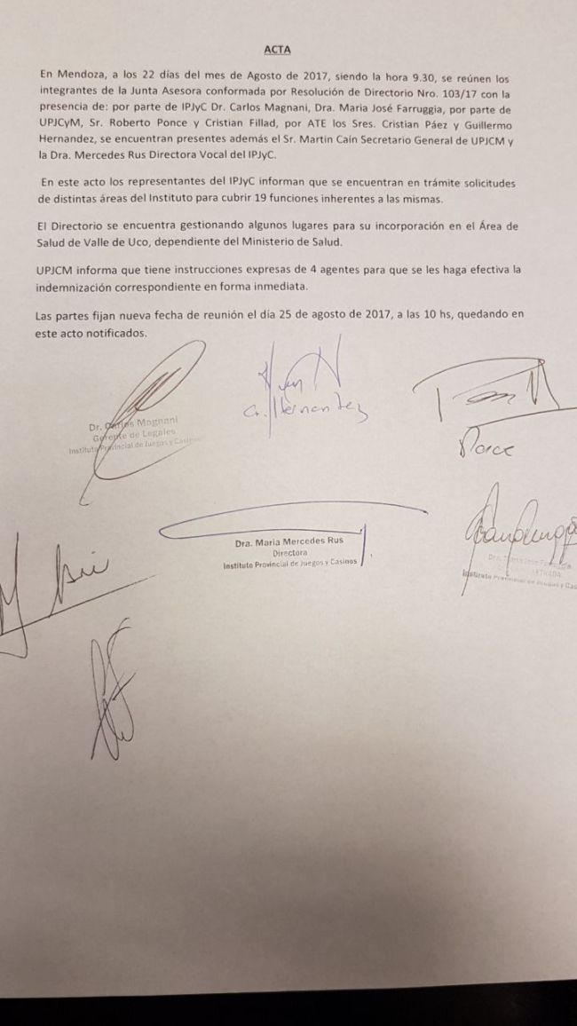 Los trámites de reubicación fueron iniciados y notificados a cada uno de los agentes por el Directorio del IPJyC. De esta situación también tomaron conocimiento los gremios UPJCM (Unión del Personal de Juegos y Casinos de Mendoza) y ATE (Asociación de Trabajadores del Estado).