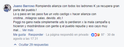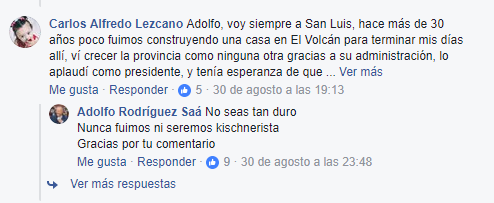 - "No seas tan duro. Nunca fuimos ni seremos kischnerista (SIC). Gracias por tu comentario".