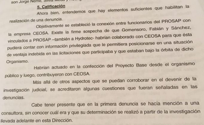 En base a las sospechas, la OA le pidió al Ministerio de Agroindustria que tome toda la información relacionada con el Prosap, CEOSA y las obras que esa empresa tuvo a cargo. Al mismo tiempo pidió alejar del tema a cualquier funcionario que pueda tener relación e incuso sugiere allanar las sedes de Hydrotec y CEOSA; ambas en Mendoza. Fuera del ámbito administrativo ya existe una causa judicial en el fuero federal, que ahora se hará más voluminosa en base a la investigación de la Oficina Anticorrupción.