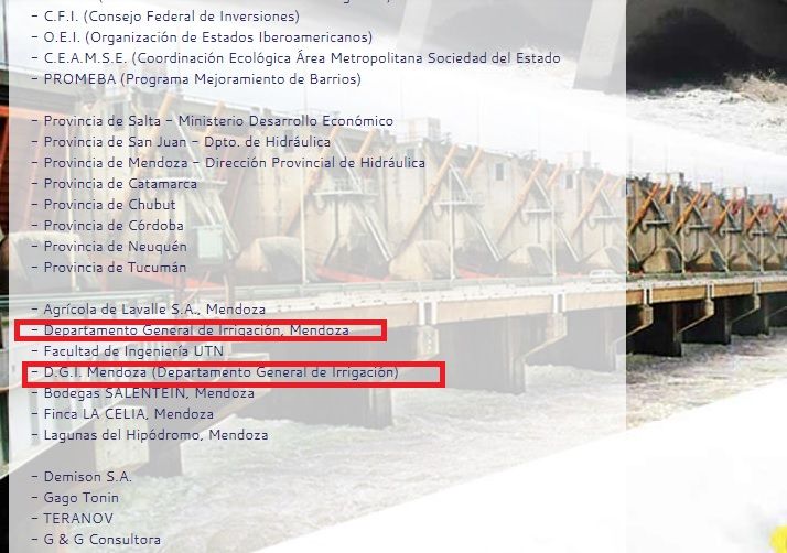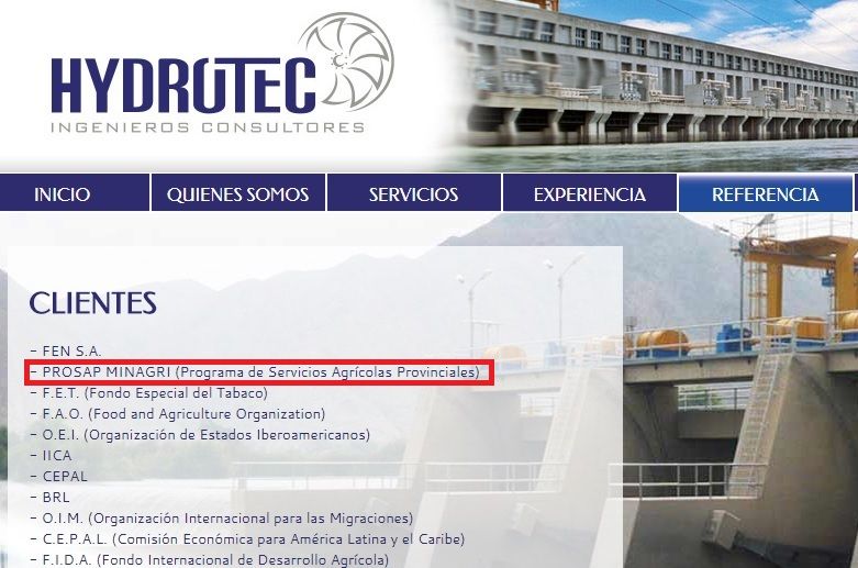 Las incompatibilidades podrían ser más profundas. Además de la vinculación con el Prosap. Hydrotec también menciona entre sus clientes al Departamento General de Irrigación, donde Gomensoro trabaja. Así figura en la página web que intentó ser borrada, pero a la que aún se puede acceder con motores de búsqueda especializados.