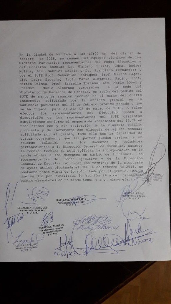 De acuerdo con esa acta, que lleva las firmas de Sebastián Henríquez (SUTE) y Ulpiano Suárez (subsecretario de Gestión Pública), entre otros, no se discutió la mejora de ningún ítem salarial para incrementar la suba del 15,7 por ciento. Tampoco se habló de la compensación del 7.6 por ciento por el desfasaje entre el aumento salarial y la inflación de 2017.