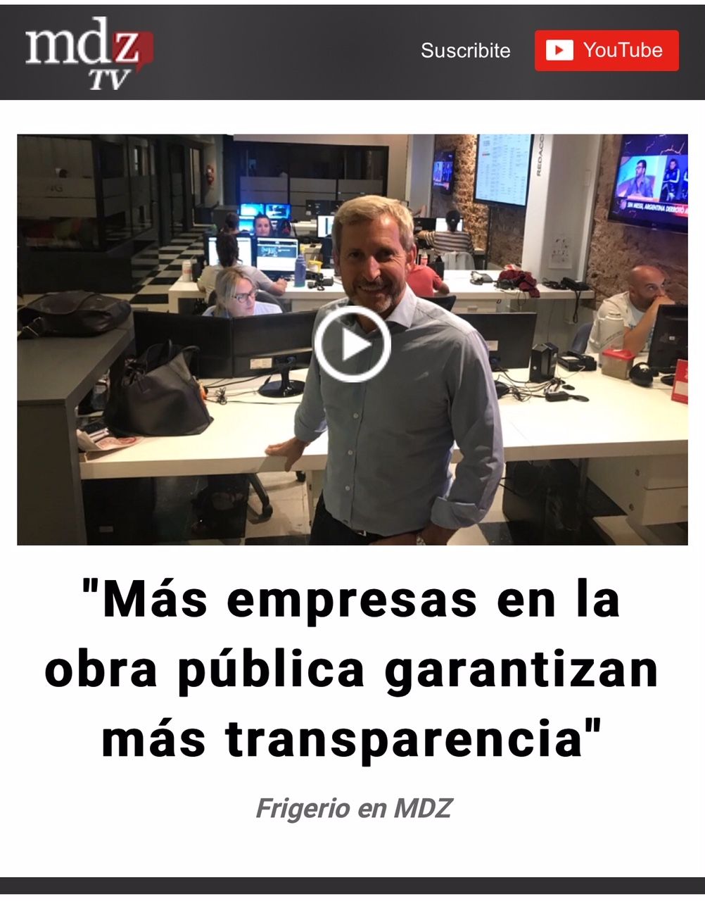 El poder de las empresas por sobre la política. El ministro que administra la obra pública en el país, Rogelio Frigerio, también respondió a la consulta sobre las empresas que han asumido un poder en muchos casos mayor que el de la política, aunque la política es la que paga las consecuencias de las ansias empresarias de un sector enquistado en la obra pública. Participó del programa "Cambio de Aire", por MDZ Radio y en vivo se animó a tratar el tema que es tabú para los empresarios, pero que desde el Gobierno parece encararse, ojalá que definitivamente. "Es importante que como consecuencia de una mayor concurrencia de empresas ha disminuido entre 15 y 20% los costos de la obra pública", señaló sobre las pequeñas grietas que todavía no terminan de desarmar cierto Olimpo de contratistas de la obra pública. Mirá el video de la entrevista en vivo a Frigerio: