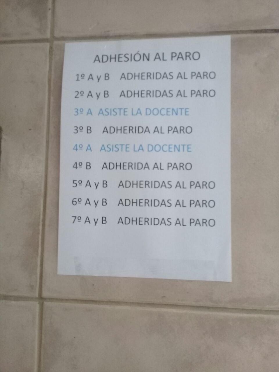 El nivel de ausentismo se reflejó en los carteles que pegaron los dos días en la entrada de la escuela: de los 14 docentes de grado del turno mañana, sólo se presentaron tres ayer y dos hoy.