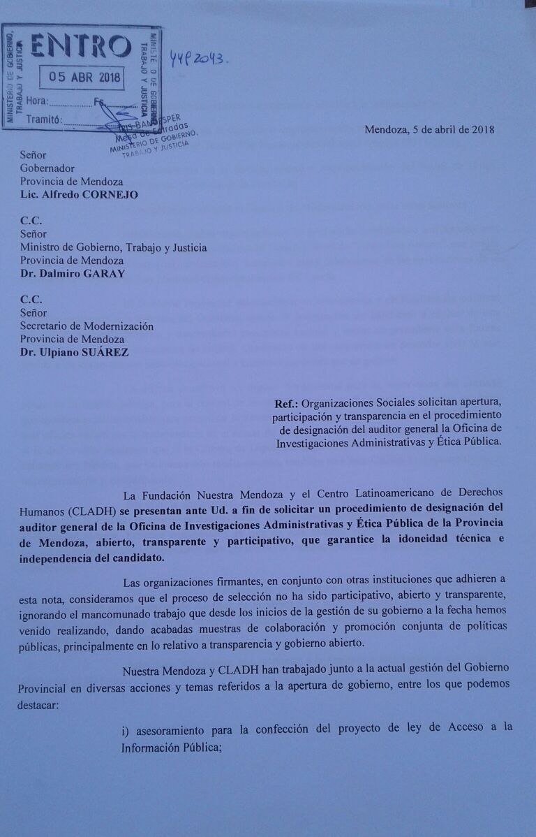 Bajo la consigna, "ONGs exigen idoneidad e independencia para el cargo de auditor de la Oficina de Investigaciones Administrativas y Ética Pública", la Fundación Nuestra Mendoza y el Centro Latinoamericano de Derechos Humanos, con la adhesión de varias ONGs le enviaron un petitorio al gobernador donde marcan su posición.