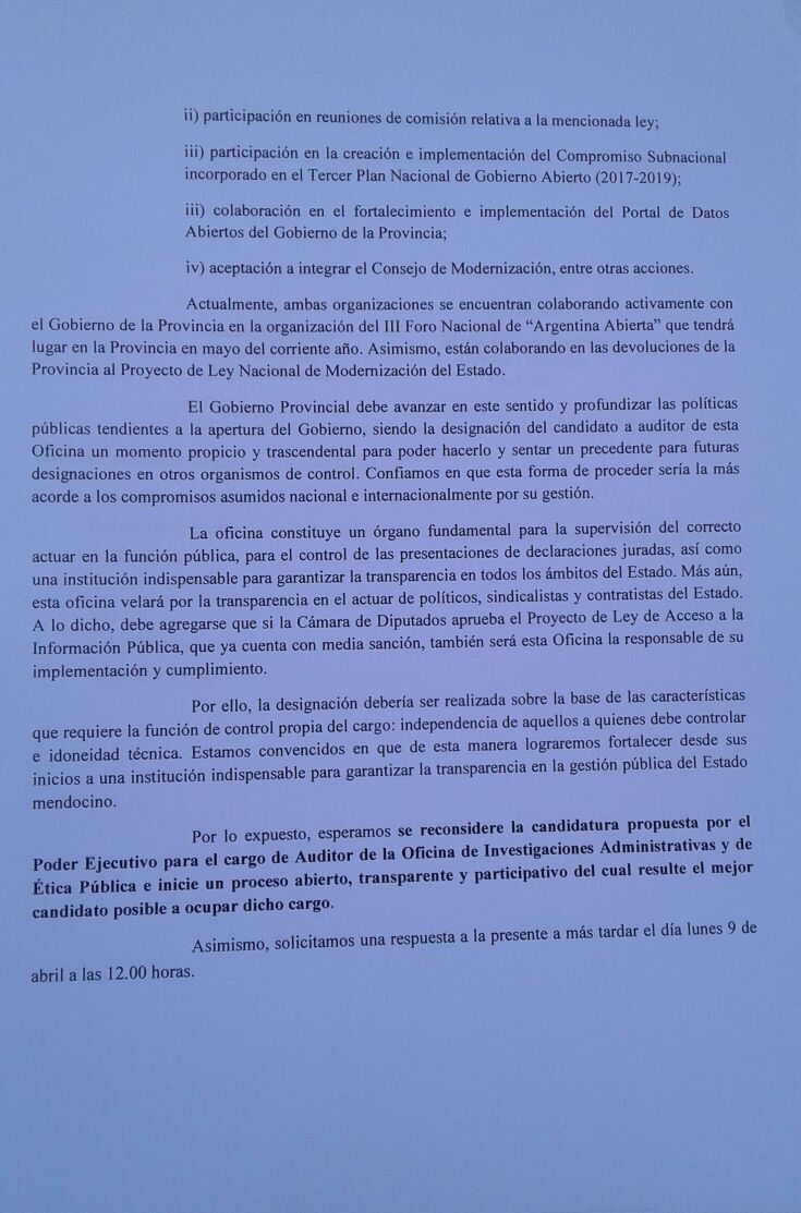 En el texto le reclaman a Cornejo "la designación de un candidato con acreditados antecedentes, idoneidad e independencia para ocupar el cargo de auditor titular de la Oficina de Investigaciones Administrativas y Ética Pública... Esta oficina constituye un órgano fundamental para la supervisión del correcto actuar en la función pública, para el control de las presentaciones de declaraciones juradas, así como una institución indispensable para garantizar la transparencia en todos los ámbitos del Estado. Más aún, esta oficina velará por la transparencia en el actuar de políticos, sindicalistas y contratistas del Estado".