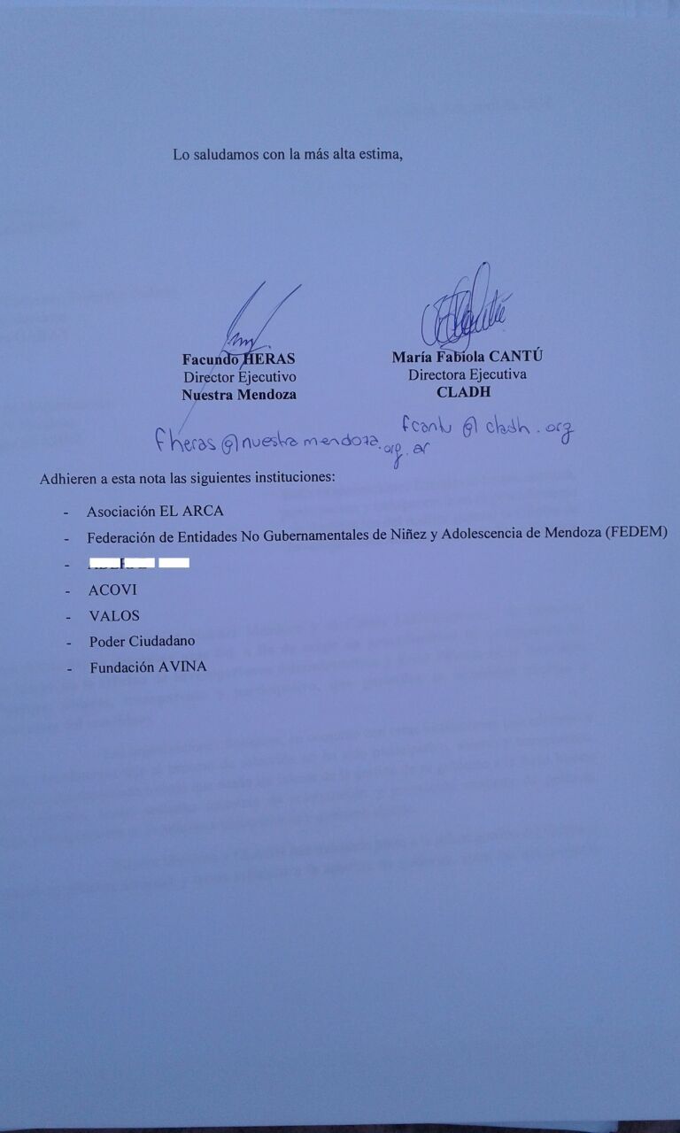 Entre las entidades locales y nacionales que suscriben esta posición se cuentan, además del Centro Latinoamericano de Derechos Humanos (CLADH) y Nuestra Mendoza, Xumec, Acovi, Valos, Xumex, Poder Ciudadano y Fundación Avina, entre otras.