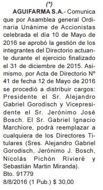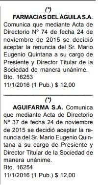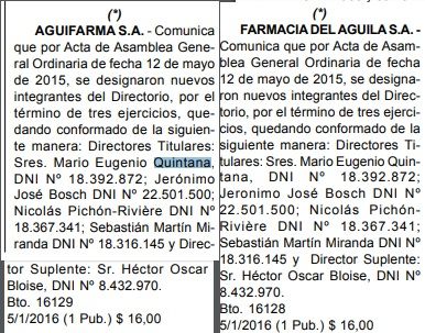 Farmacity tiene presencia en Mendoza a través de dos sociedades anónimas que controlan las cadenas Del Águila y Mitre. Se trata de Farmacias del Águila SA y Aguifarma SA. Las dos fueron creadas y presididas por Mario Quintanta. Incluso la gestión a cargo de las empresas vencían este año. Sin embargo, el 24 de noviembre de 2015 Quintana renunció a la presidencia de las dos sociedades. El hombre ya tenía destino político en la mesa chica del presidente Mauricio Macri. En 2016 fue nombrado como presidente de las sociedades Alejandro Gorodisch, es decir el mismo presidente de Farmacity. También quedaron en la sociedad dos de los controlantes de Pegasus, la firma inversora por la cual Quintana operaba, Jerónimo Bosch y Nicolás Pichón Riviere. El propio Quintana explicó luego que ellos tienen el mandato para decidir sobras sus propias acciones en Farmacity y, se supone, también por Aguifarma SA, la versión mendocina de esa empresa.