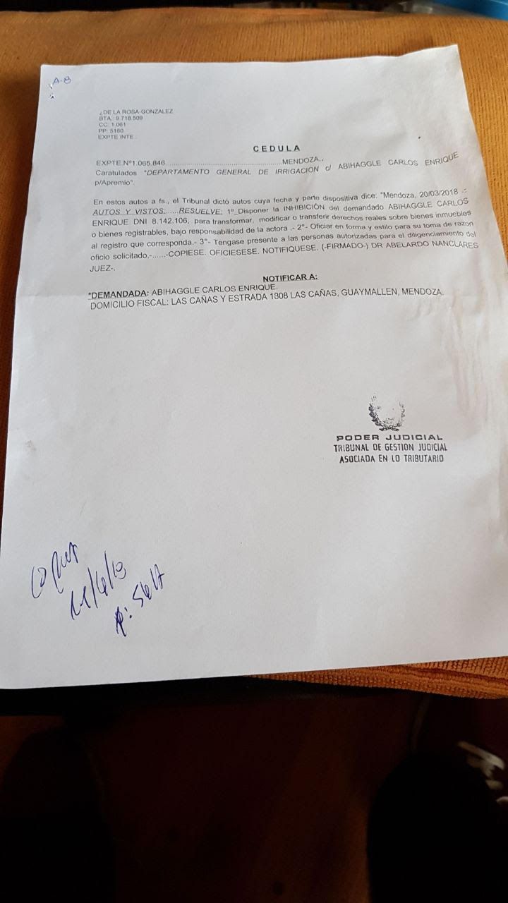 El caso que protagoniza el superintendente de Irrigación de Arturo Lafalla (PJ) y de la primera parte de la gestión de Roberto Iglesias (UCR) es muy particular. Abihaggle nunca aceptó la deuda que le exigía el organismo que dirigió y, por ello, el caso terminó con una inhibición judicial en su contra, tal como consta en esta cédula.