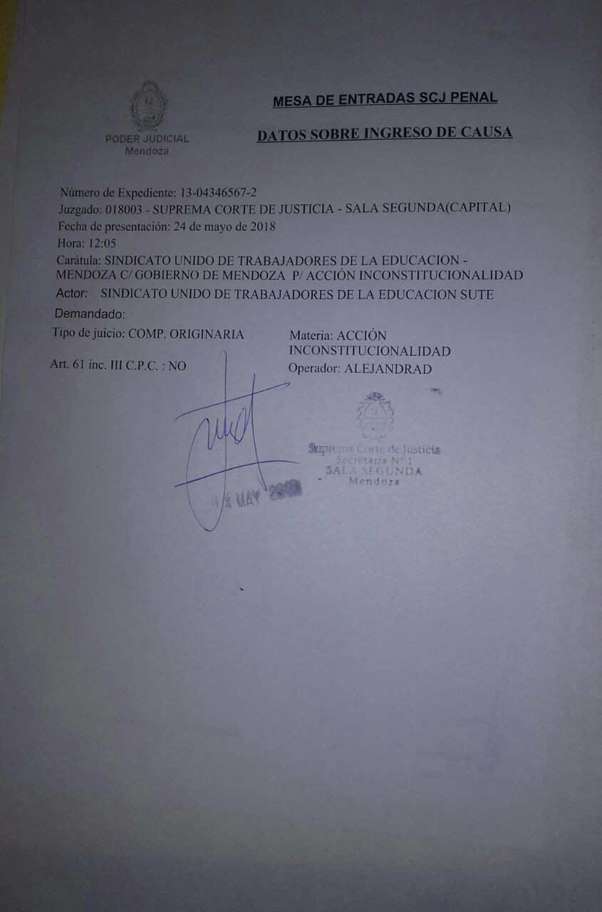 El SUTE decidió que apelaría esta decisión ante la Corte Nacional. Mientras tanto, comenzó otra vez a batallar contra Cornejo en la Justicia provincial por el nuevo decreto, demanda que recayó de nuevo en el mismo lugar que la anterior: la Sala Segunda del alto tribunal mendocino.