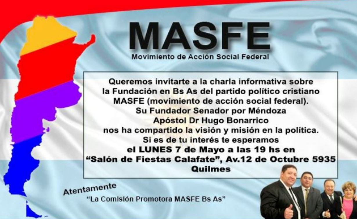 Siempre un paso adelante, Bonarrico puso la mira y la inversión en el principal distrito electoral, Buenos Aires, con el objetivo de instalar allí su fuerza política. Para dar detalles de su cruzada, este lunes ofreció una charla informativa en Quilmes para presentar en ruedo ajeno al "partido político cristiano" (sic) Movimiento de Acción Social Federal (MASFE), creado en Mendoza. Para el líder evangélico, con los hombres no alcanza para enderezar el rumbo del país: "En la Argentina, solamente con la democracia no se han solucionado los problemas de la pobreza, inseguridad, exclusión social. La solución entonces está en la Teocracia, Dios gobernará esta tierra a través de sus hijos, obedientes a la palabra de Dios".
