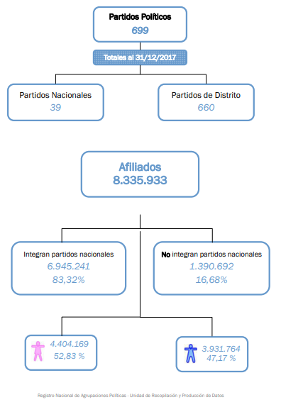 Con datos actualizados hasta el 15 de enero de 2018, hay 39 partidos políticos de "orden nacional". En tanto que la cantidad de fuerzas reconocidas a nivel distrital asciende a 660. Lógicamente, Buenos Aires aglutina la mayor cantidad de estas agrupaciones (75) y Chubut la menor (12).
