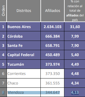 En función del porcentaje de electores que están afiliados en cada distrito, en Mendoza representan el 24,49%. Con 344.647 afiliados, la provincia representa el 4,13% del total de afiliados de todo el país.