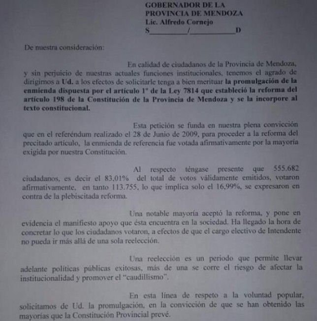 Lo cierto es que los 13 jefes comunales le planteaban a Cornejo la "profunda convicción" de que, en el referéndum realizado el 28 de junio de 2009, la enmienda había conseguido "la mayoría exigida por la Constitución".