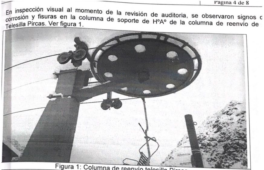 La descripción que hace el Dideme sobre el estado de las aerosillas es muy gráfica. "Se observaron signos de corrosión y fisuras en la columna de reenvío de la telesilla Pircas", advierte el informe. Dice también, al respecto de estos aparatos, que no se ha encontrado "documentación sobre mantenimiento de cables, perchas y sillas" y que tampoco hay registro de "ensayos del sistema de suspensión (torres, balancines y poleas)".