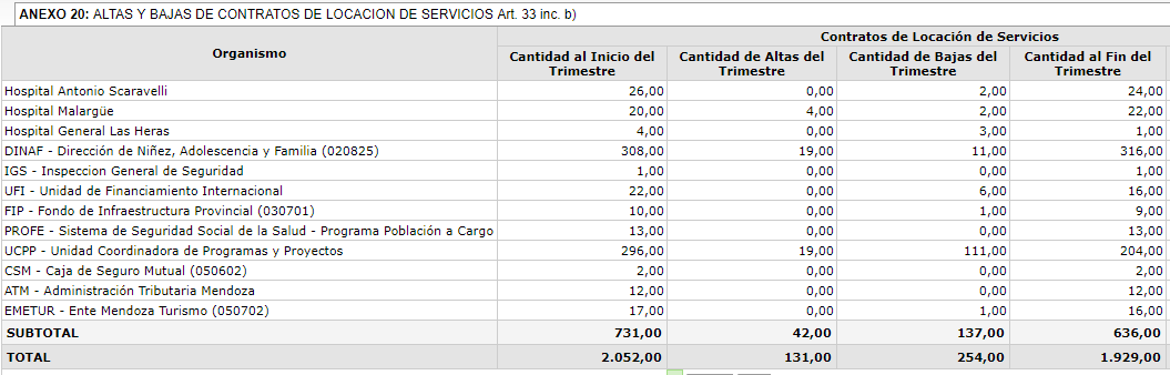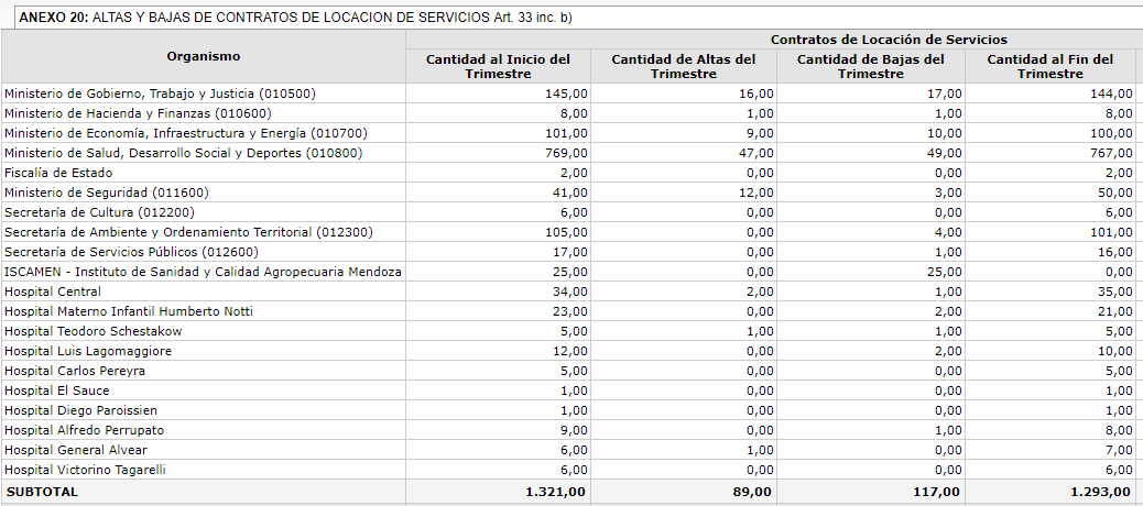 El Tribunal de Cuentas difundió en la última semana algunos datos del primer informe trimestral de este año de la Ley de Responsabilidad Fiscal. Uno de ellos, el correspondiente a las altas y bajas en los contratos de locación de servicios en la administración pública provincial.