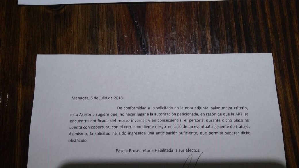 En dicha nota se especificó que "el personal no cuenta con cobertura" de ART ante un eventual accidente de trabajo durante el receso legislativo y que, por lo tanto, no tenía autorización para ir a trabajar.