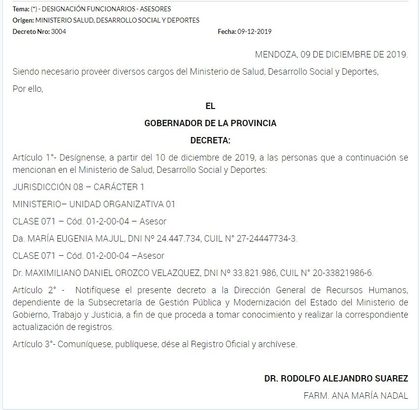 En el mismo decreto -firmado por Suarez y la ministra Ana María Nadal- también se designa como asesor a Maximiliano Daniel Orozco Velázquez, hijo del intendente Daniel Orozco y la exprecandidata a vicegobernadora, Susana Velázquez. Al igual que Majul, se le otorga una clase 71.