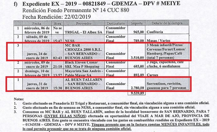 Por si eso fuese poco, también pasaron facturas de comidas que tuvieron lugar durante su estadía en la costa atlántica. Por ejemplo, el 24 de enero comieron en San Bernardo y entre los platos había tres menú infantiles. Para el Tribunal de Cuentas ese dato no es menor, ya que sirve para confirmar que no se trataba de un viaje laboral. También aparecen en el ticket, cervezas, fernet, lomos, hamburguesas y café.