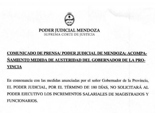 La Suprema Corte confirmó que adherirá al plan de austeridad propuesto por el gobernador Rodolfo Suarez y también congelarán los salarios por seis meses. Pero lo harán a su manera y con los condicionantes que tiene el caso. Es que los jueces de Mendoza tienen un régimen especial y tienen su salario atado a lo que decida la Corte nacional, alejado de lo provincial.