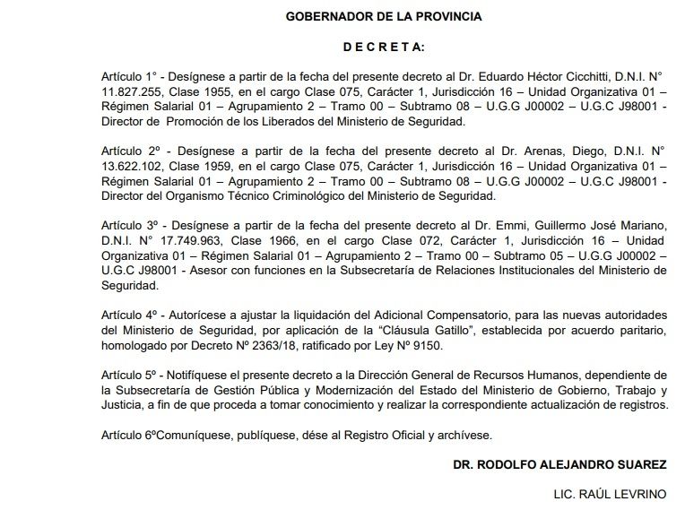 En el mismo decreto de hay otros dirigentes políticos que fueron designados. El demócrata Diego Arenas, por ejemplo, fue designado como director del Organismo Técnico Criminológico.