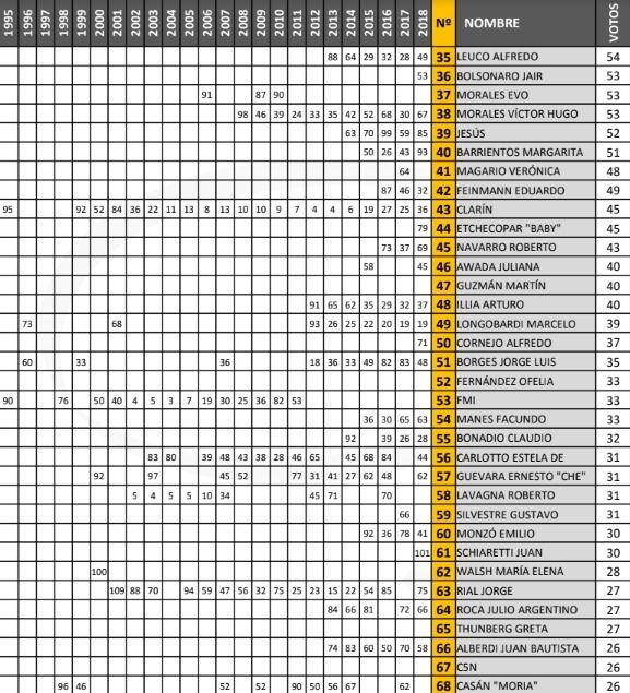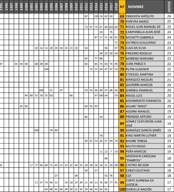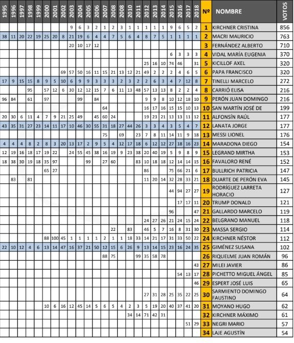 En 2018, la expresidenta había quedado relegado al segundo lugar por el entonces presidente de la Nación, Mauricio Macri. En esta ocasión, el exmandatario perdió el primer puesto, pasó al segundo, pero así y todo superó al actual mandatario, Alberto Fernández.