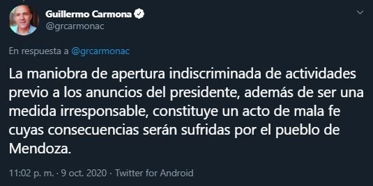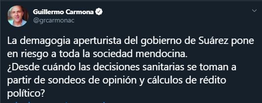 En su cuenta de Twitter, Carmona indicó lo siguiente: "La demagogia aperturista del gobierno de Suárez pone en riesgo a toda la sociedad mendocina. ¿Desde cuándo las decisiones sanitarias se toman a partir de sondeos de opinión y cálculos de rédito político?".