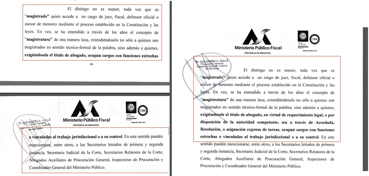 Ese párrafo fue cambiado en el segundo dictamen y la sutileza del cambio es sustancial desde lo jurídico. Así quedó redactado finalmente: "(...) extendiéndoselo no solo a quienes son magistrados en sentido técnico formal de la palabra sino además a quienes exigiéndosele el título de abogado , en virtud de requerimiento legal , o por disposición de la autoridad competente, sea a través de Acordada, Resolución, o asignación expresa de tareas, ocupan cargos con funciones estrechas o vinculadas al trabajo jurisdiccional o a su control".