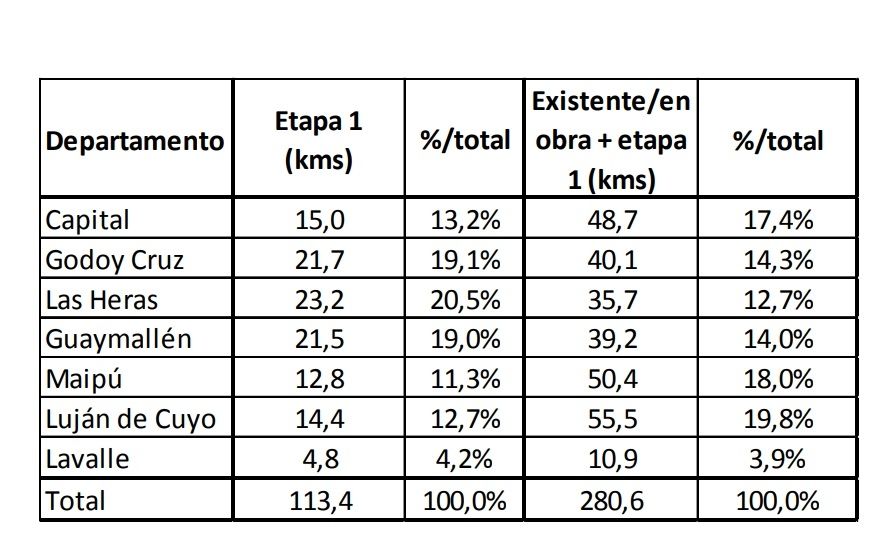 "Aquellos municipios que parten de un menor inventario de ciclovías, con gran cantidad de población y relativamente menores ingresos (Guaymallén, Las Heras) son los municipios donde más infraestructura se propone construir, especialmente respecto a su inventario existente", dice el proyecto ejecutivo. Justamente allí comenzó de disputa por los kilómetros de obra a financiar en cada comuna.