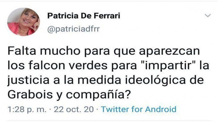 Patricia De Ferrari, diputada de Juntos por el Cambio, generó polémica y repudio en las redes sociales por una publicación en la que se preguntó si "falta mucho para que aparezcan los Falcon verde para impartir justicia a la medida ideológica de Juan Grabois y compañía".
