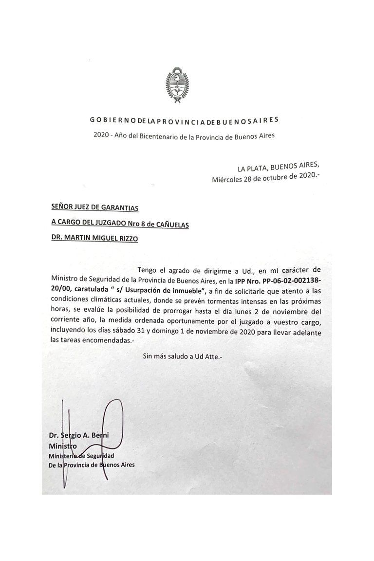 Berni le recordó al magistrado que para los próximos días “se prevén tormentas intensas”, y le sugiere que “evalúe la posibilidad” de postergar la medida “incluyendo los días sábado 31 y domingo 1 de noviembre”. Fuente: Infobae