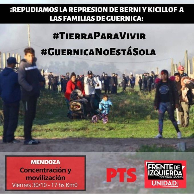 El Frente de Izquierda y de los Trabajadores y el PTS (Partido de los Trabajadores Socialistas) saldrán a la calle este viernes en Mendoza a manifestarse por "la represión de Berni y Kicillof" a las familias de Guernica.
