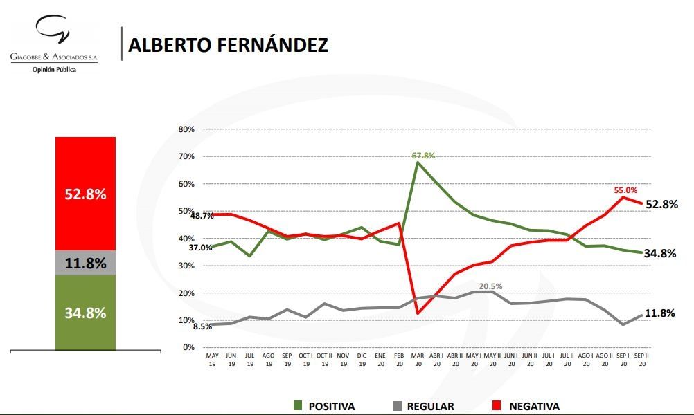 Así se desprende de una nueva encuesta política realizada por la consultora Giacobbe & Asociados. Para tener un parámetro, en marzo de 2020 la imagen positiva del Presidente era del 67,8%, mientras que la negativa se ubicaba apenas arriba del 10%.