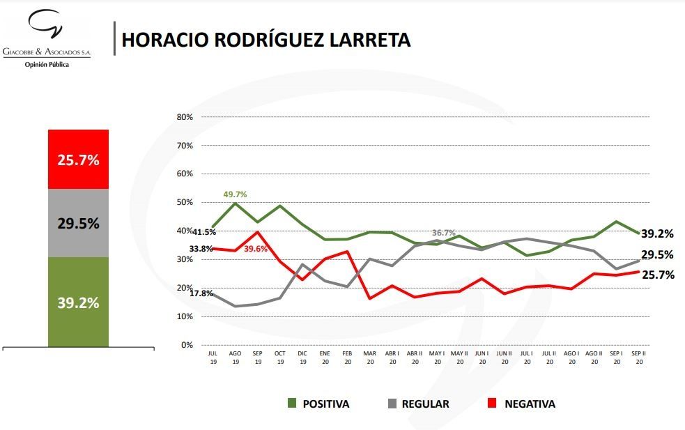 Distinta es la situación del jefe de Gobierno porteño, Horacio Rodríguez Larreta, quien si bien en el último mes también vio caer su imagen positiva y subir su negativa, se mantiene con números favorables.