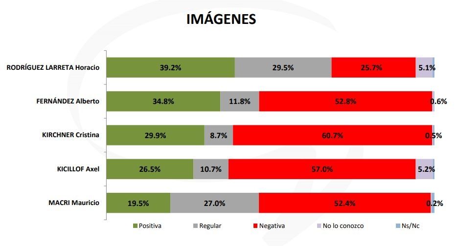 Respecto de la imagen negativa, la líder es Cristina, con un 60,7%, seguida por Kicillof con 57%, y Fernández con el 52,8%. Por su parte, Macri tiene una imagen negativa del 52,4%, mientras que el mejor en ese rubro es Larreta, que tiene un 25,7%.