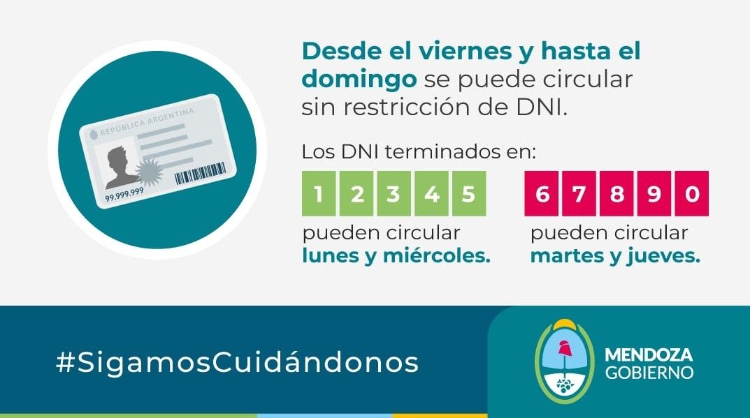 De esta manera, a partir de ahora el control de DNI sólo aplicará de lunes a jueves. Lunes y miércoles podrán ir a comercios, supermercados y salidas de esparcimiento los documentos terminados del 1 al 5, mientras que martes y jueves quienes tengan finalización del 6 al 0.